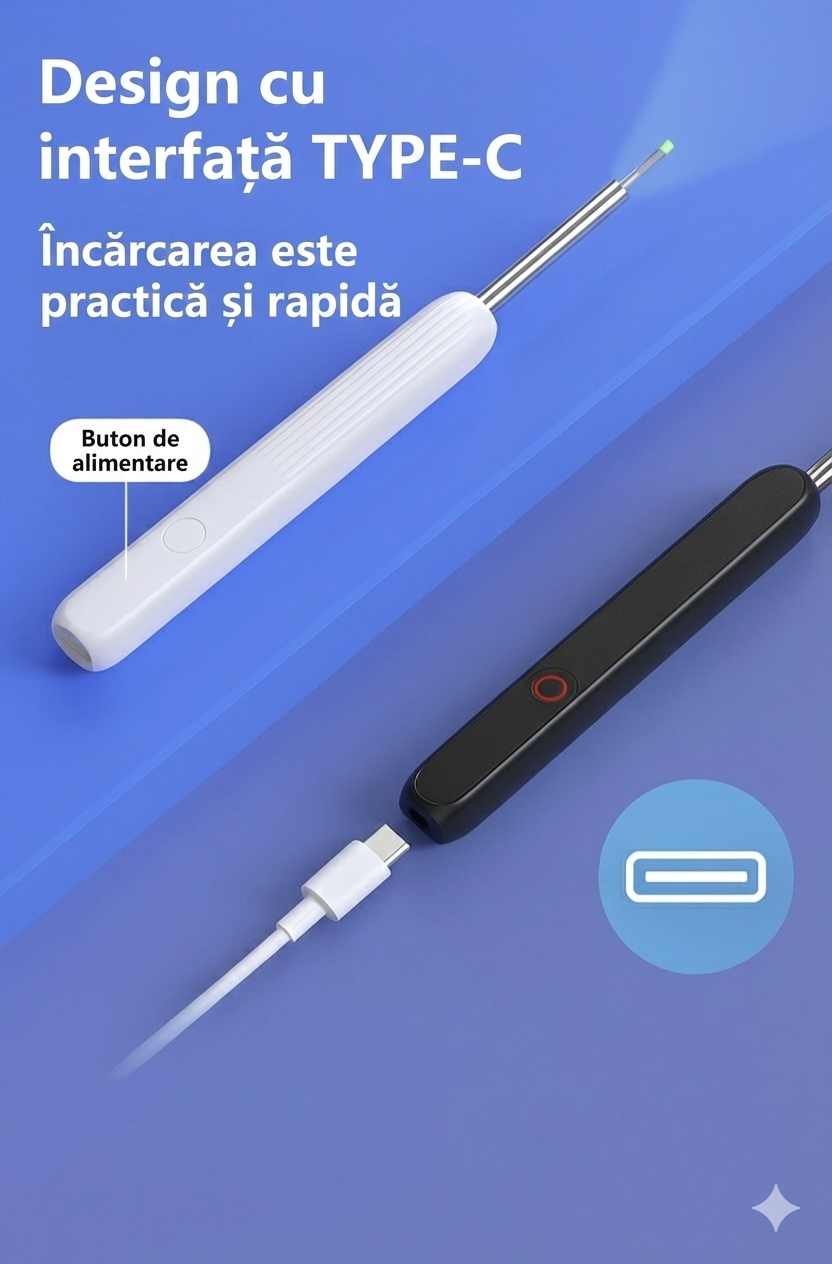Avantaje detaliate: 1- 👁️ Cameră HD: Vizualizare în direct pentru o curățare precisă. 2- 🔋 Reîncărcabil prin USB: Autonomie de lungă durată, utilizabil oriunde. 3- 🌟 Capete flexibile și sigure: Potrivite pentru întreaga familie. 4- 🌐 Conexiune wireless: Compatibil cu Android și iOS. 5- ♻️ Eco-friendly: Nu mai ai nevoie de bețișoare de unică folosință.